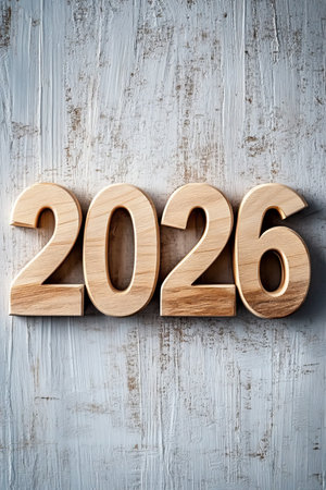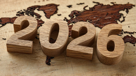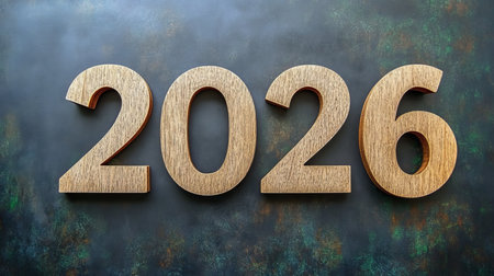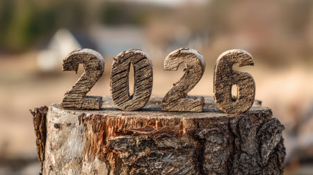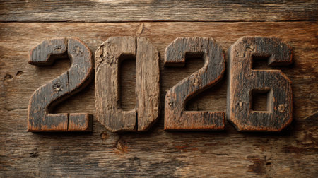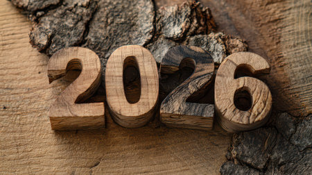 Decorative wooden numbers showcase 2026 resting on a textured wooden surface symbolizing hopes for growth and new beginnings in the coming year.