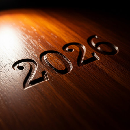 Close-up of a wooden block featuring the year 2026, intricately carved into its surface, showcasing natural grain and rustic charm. Perfect for celebration themes.