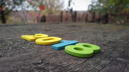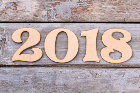 Cutout wooden number 2018 on old wooden background. Carved wooden digits forming number 2018 of the New Year on old rustic wooden table.