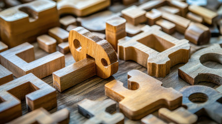 An array of beautifully crafted wooden puzzle pieces lies scattered on a rustic surface, highlighting their unique shapes and textures under soft natural light, inviting curiosity and creativity.