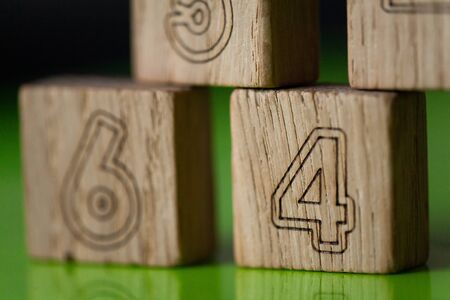 Arithmetic, mathematic, learning concept, numbers background with wooden cubes, copy space. Teaching a child of preschool age mathematics