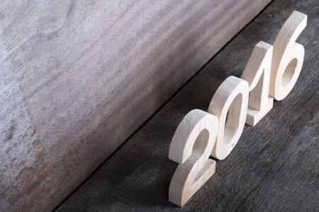 Wooden figures 2016 on gray wooden background.