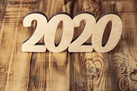 New year number 2020 lined with wooden figures on the wooden surface. Happy New Year.