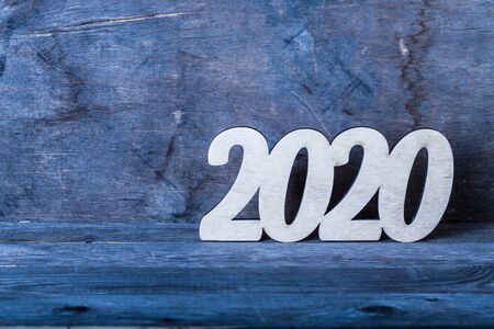 Wooden number of 2020 from 2019 to 2020 on blue rustic background