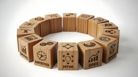 A creative arrangement of wooden blocks depicting various facial expressions, illustrating emotions such as joy, sadness, and surprise in a playful and artistic manner.