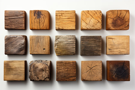 Elegant wooden blocks showcase varied grain patterns, seamlessly transitioning through warm, earthy hues on a sleek, reflective white surface under gentle lighting.
