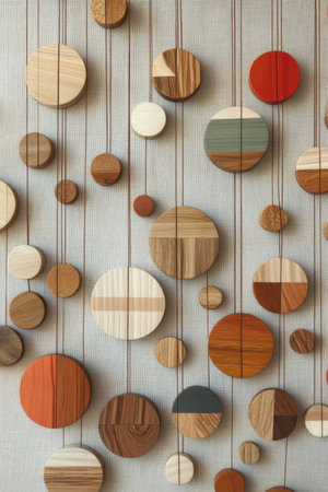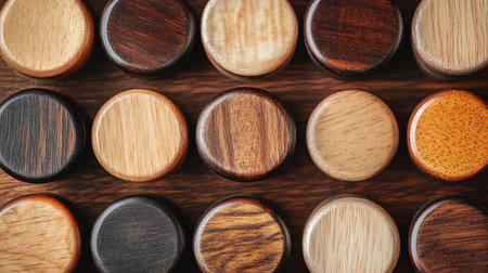 This image showcases a variety of natural wooden discs arranged in a visually appealing pattern. The different shades and textures highlight the beauty of wood in artistic and craft applications.