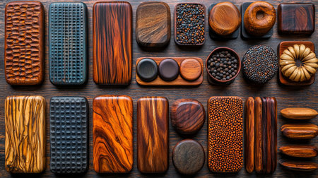 An assortment of textured wooden objects and spices arranged on a rustic table. Highlights natural materials and traditional craftsmanship.