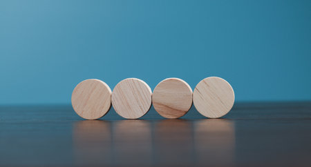 Wooden cylinders are neatly aligned on a dark surface showcasing their smooth texture and natural color. The lighting creates subtle shadows.