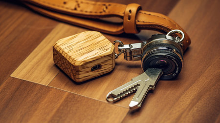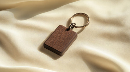 Wooden minimalist keychain with soft grains, set diagonally on a cream-colored table