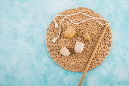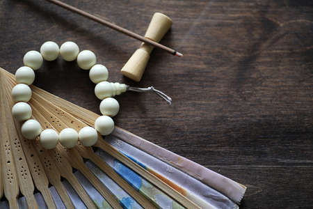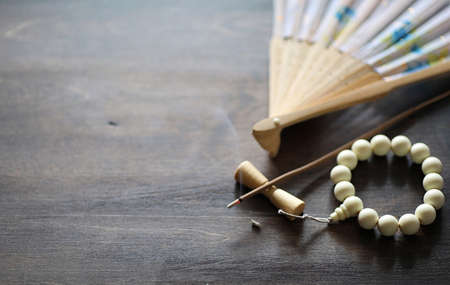 Different objects with traditional religious oriental on a wooden background