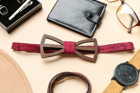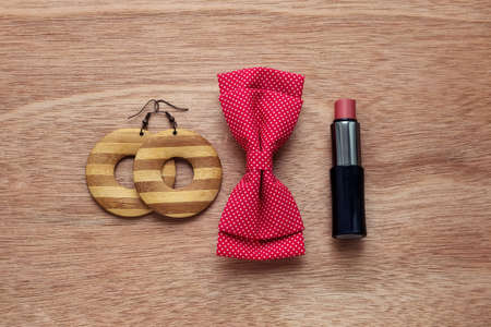 Fashion accessories on wooden surface. Earrings, bow tie, lipstick. Female accessories. Hipster lifestyle