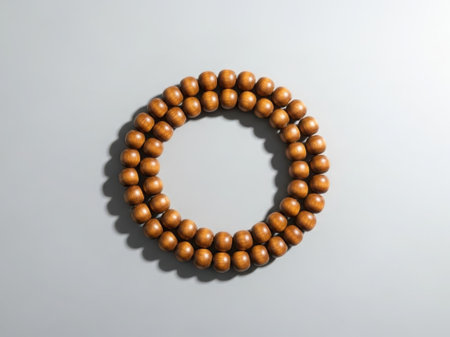 Warm sunlight illuminates a wooden beaded bracelet resting on a textured surface creating a peaceful and serene mood Ideal for meditation or wellness themes.