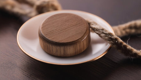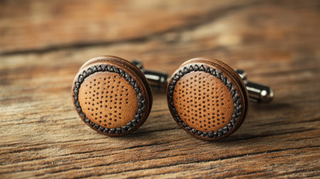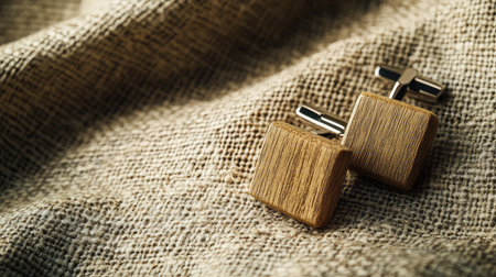 A captivating close-up of wooden cufflinks resting on textured fabric, showcasing the harmony of natural materials and sophisticated design ideal for fashion photography.