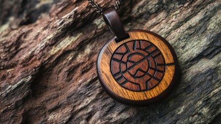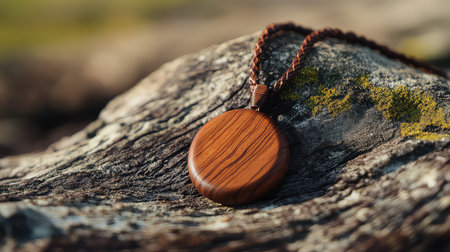 Captivating wooden pendant resting on a textured natural surface, showcasing intricate craftsmanship and a unique design. Perfect for fashion enthusiasts seeking artisan jewelry options.