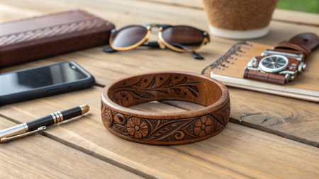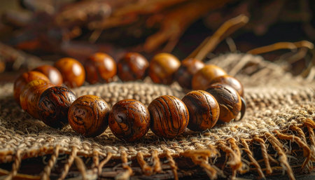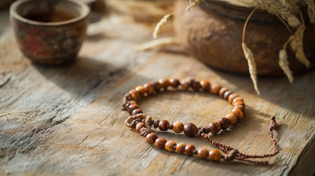 This image captures a beautifully crafted wooden beads bracelet elegantly displayed on a rustic table. Surrounded by earthenware and dried plants, the scene highlights the bracelet's natural texture and earthy tones, creating a serene and calming atmosphere perfect for relaxation and meditation.