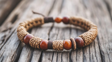 This image features a handmade bracelet adorned with natural beads, resting on a rustic wooden surface. The organic materials and intricate weaving highlight artisan craftsmanship.