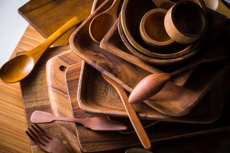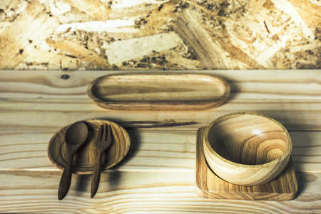 Still life with set of Wood Dining Set on wooden table.