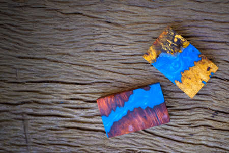 Cube casting epoxy resin with nature burl BURMA PADAUK and maple wood on the old table