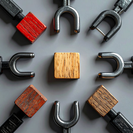 A single, unique wooden block stands out at the center, surrounded by a diverse array of tools.