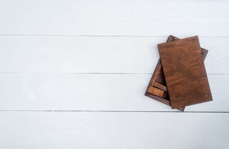 Empty blank wood boxe for gift or photos with usb stick, free space. Packaging for photo and USB drive on white wooden background. Information and mail concept