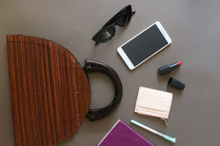 Handbag and content of the bag arranged on gray background. Flat lay.