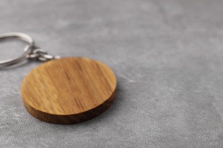Wooden keychain in shape of smiley face on gray background, closeup. Space for text