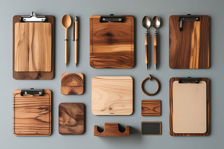 An assortment of textured wooden objects and spices arranged on a rustic table. Highlights natural materials and traditional craftsmanship.