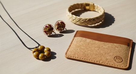 A flat lay of sustainable and handmade fashion accessories on a light wood surface. Includes a cork and brown leather card holder, a woven straw bracelet, stud earrings with dried flowers in resin, and a necklace with mustard-yellow beads.