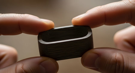 A close-up macro shot of fingers holding a small, black, hollow rectangular object with rounded corners. The focus is on the texture of the object and the skin details, presenting a minimalist or abstract view of a component or design element.