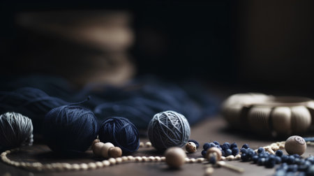 Yarn balls, beads and other accessories for knitting on a dark background