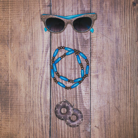 fashion accessories on wooden surface. glasses, necklace, earrings