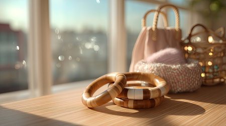 This captivating image features elegant wooden bangles displayed on a sunlit table, complemented by a stylish purse and soft knitted fabric in the background.