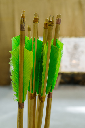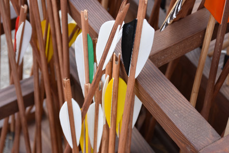 Colorful shafts of wooden arrows with real bird feathers for shooting with a bow.