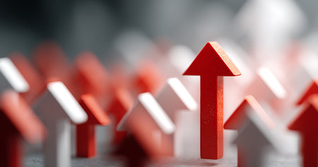 Vibrant red and blue wooden arrows ascend on pristine white blocks, symbolizing growth and progress against a calming teal backdrop.