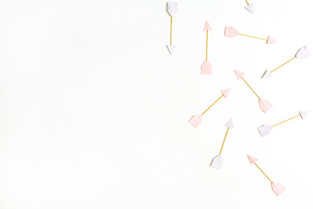 Paper Cupid arrow symbols on pink background. Flat lay, top view Valentines Day background love concept.