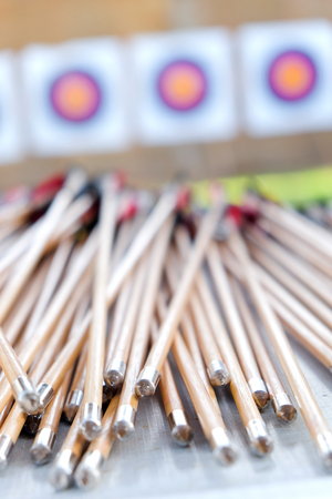 Close-up of a box of arrows showing the fletchings, arrows are use for sport and hunting