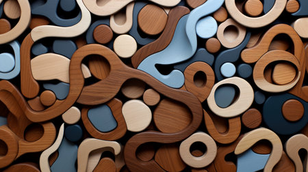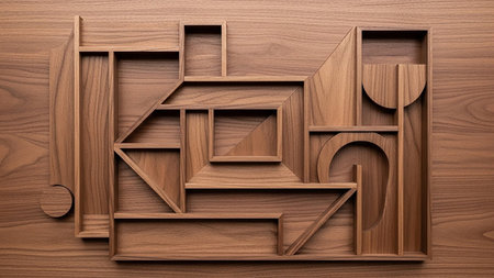 An abstract geometric arrangement of interlocking wooden shapes and compartments is set against a warm brown wood grain background.