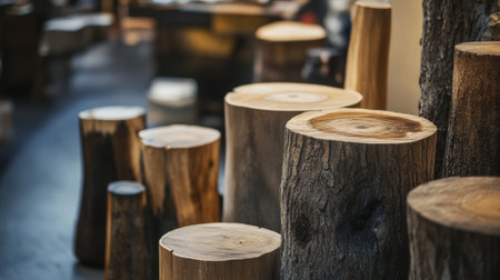 Several wooden stools are illuminated by warm sunlight, creating contrasting shadows and highlights. The rough textures of the wood are emphasized by the lighting, showcasing the natural patterns and grains. This image could be used for design concepts, interior decoration, or commercial applications.