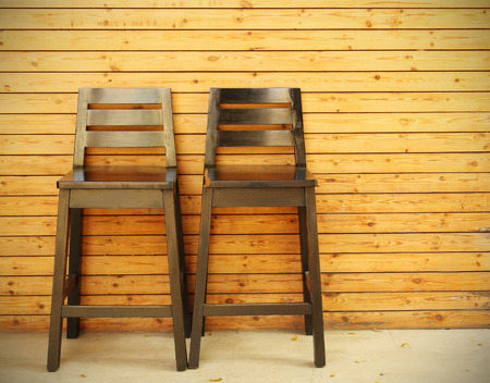 Wooden chairs natural brown and black located in front the smooth plaster walls.