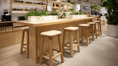 This is a modern bar interior featuring stylish wooden stools and lush greenery, creating a bright and inviting atmosphere for social gatherings.