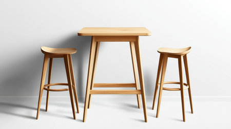 A modern wooden table accompanied by two matching bar stools, emphasizing minimalism. Ideal for contemporary settings, this furniture evokes warmth and elegance.