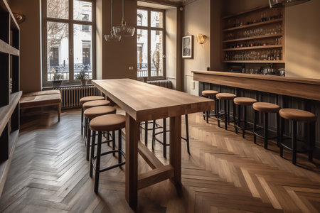 Cozy cafe interior with rustic wooden furniture and natural lighting