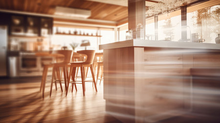 Cozy cafe interior with bar island and eating space with minimalist furniture