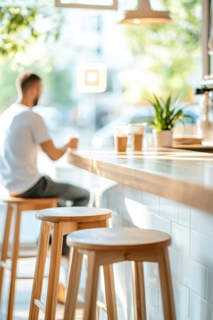 Wooden bar stools line a sleek counter in a modern cafe decorated with warm lighting. The inviting space features a rustic wooden interior, creating a comfortable atmosphere for customers