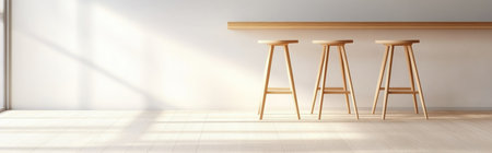This image features wooden bar stools arranged neatly against a wall, enhanced by beautiful shadows and warm sunlight, creating a serene cafe atmosphere.