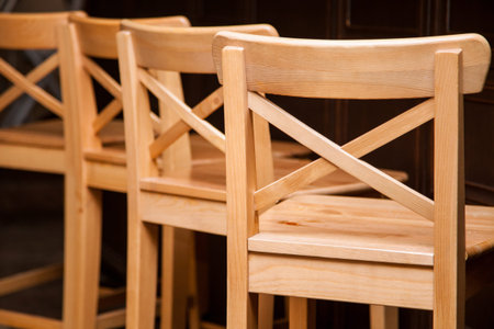 Row of retro style wooden bar stools and modern wooden tables in cafe.