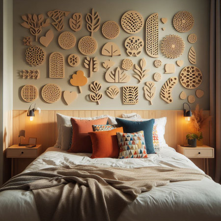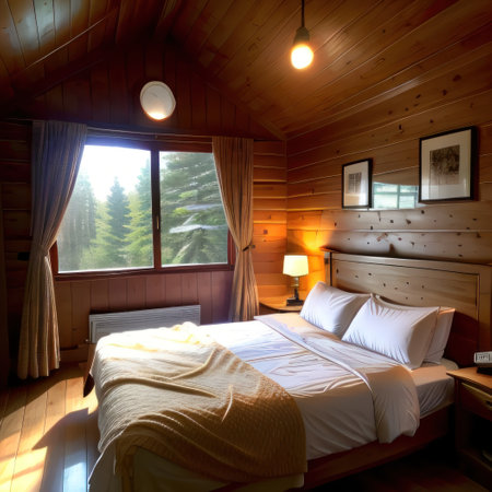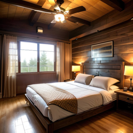 A cozy bedroom featuring wooden bed, soft bedding, and natural decor elements. warm lighting and plants create serene atmosphere, perfect for relaxation and comfort