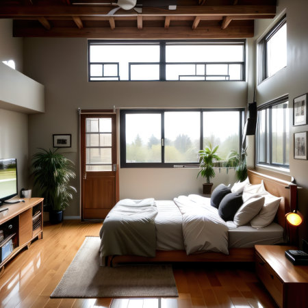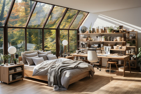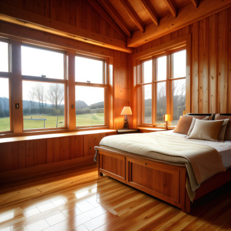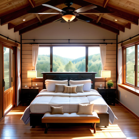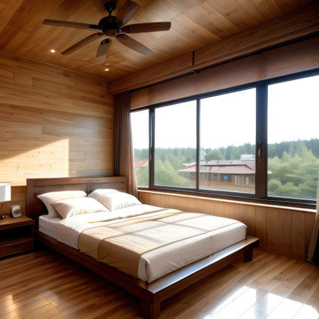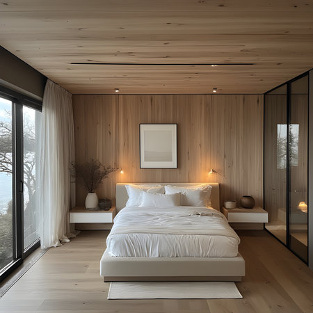 A serene and stylish bedroom featuring large windows that bring in natural light, wooden furniture, and cozy textiles, perfect for relaxation and tranquility.
