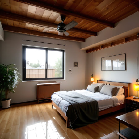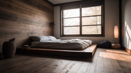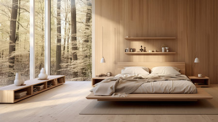 This cozy minimalist bedroom showcases warm wooden accents, ample natural light, and a tranquil ambiance, creating a perfect relaxation haven.
